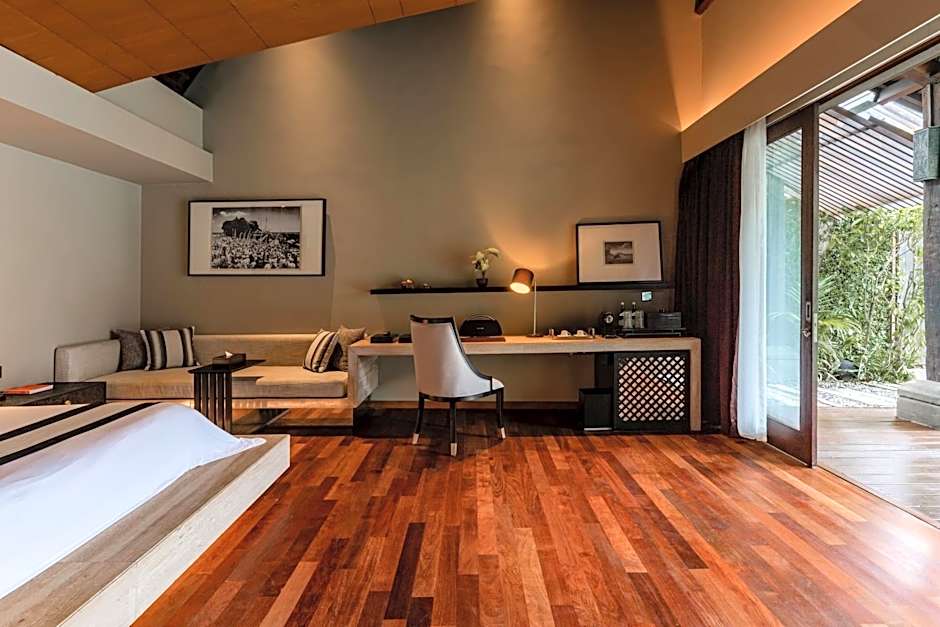 Each of these two interconnecting and spacious villas features air conditioning and a patio overlooking the private pool. A flat-screen TV with DVD player and mini-bar is provided in the living room. Private bathroom comes with a shower, bathtub and free toiletries. Semi outdoor style bathroom. The villa has a separate gourmet kitchen and dining area with private butler services available.